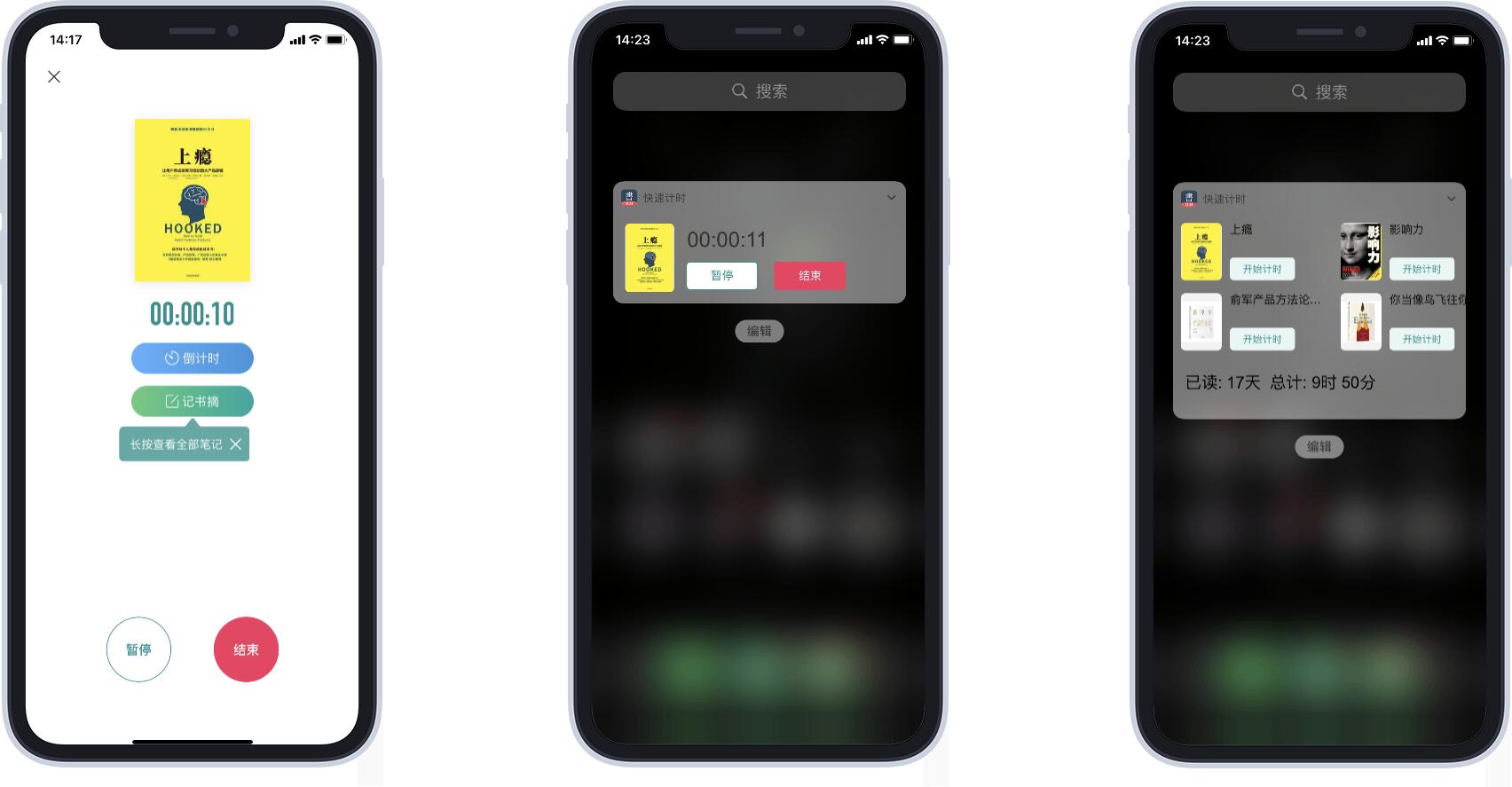 「阅读记录」还提供了 Widget 小组件,这样我们可以在无需打开 App 的情况下,直接「一键计时」,操作更便捷。