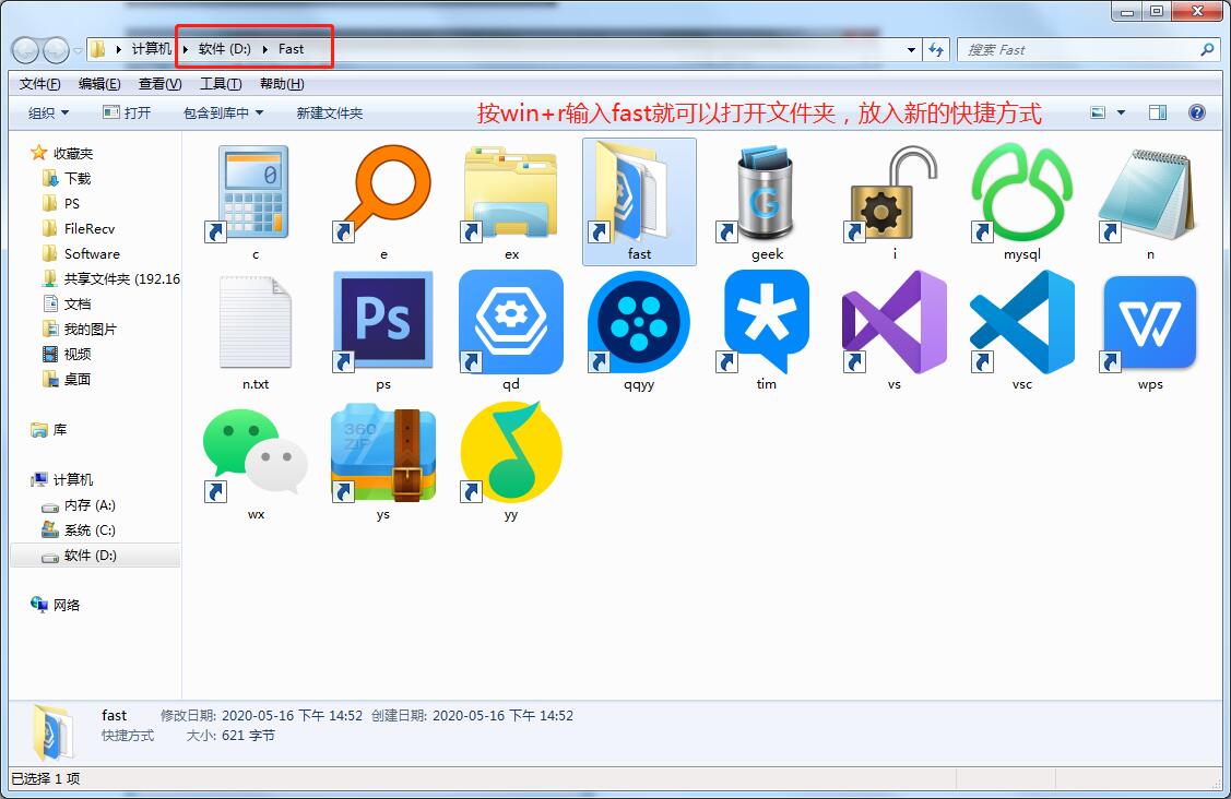 例如把fast文件夹快捷方式放在fast文件夹里,那样输入fast就可以快速打开该文件夹,放入新的快捷方式 ,公司win7和家里win10都在这么用,没发现哪里比较麻烦呀