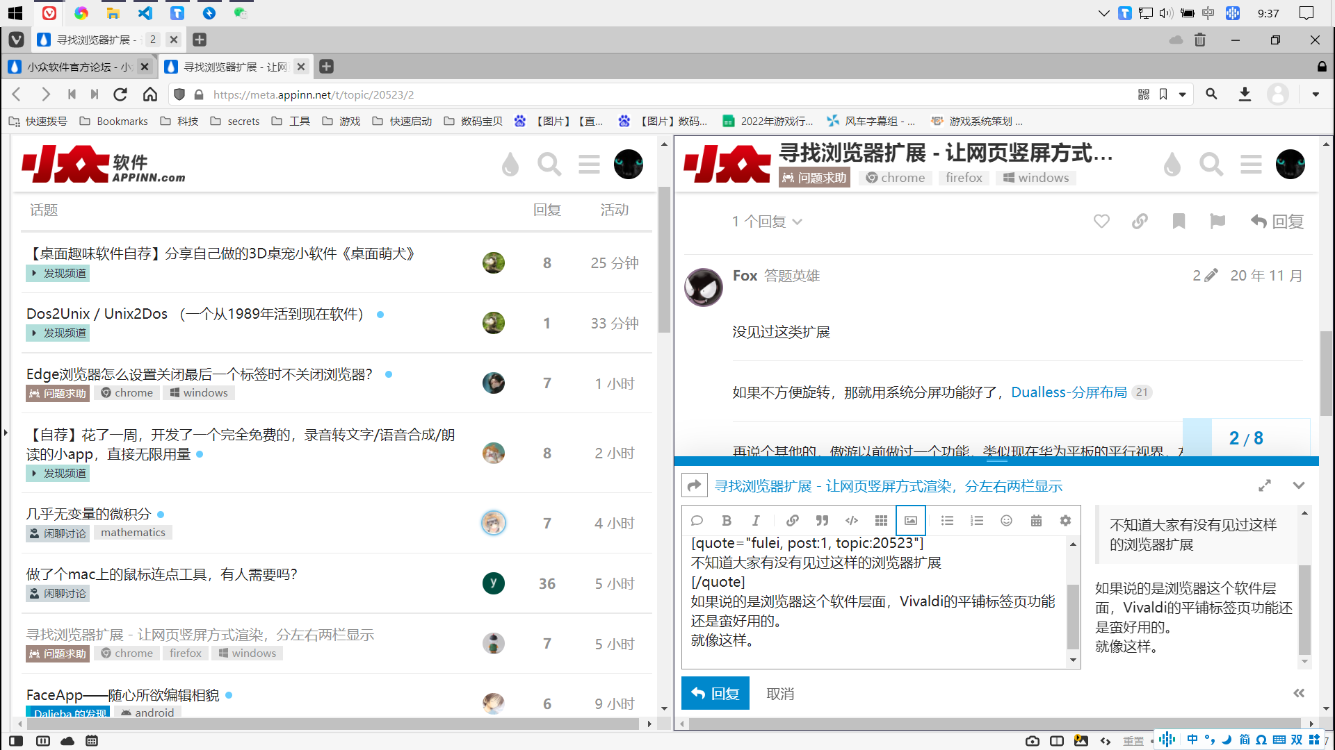 不知道大家有没有见过这样的浏览器扩展,甚至推而广之,让 Windows 整个系统桌面都分成左右两栏显示的软件也行(有点异想天开了哈哈)