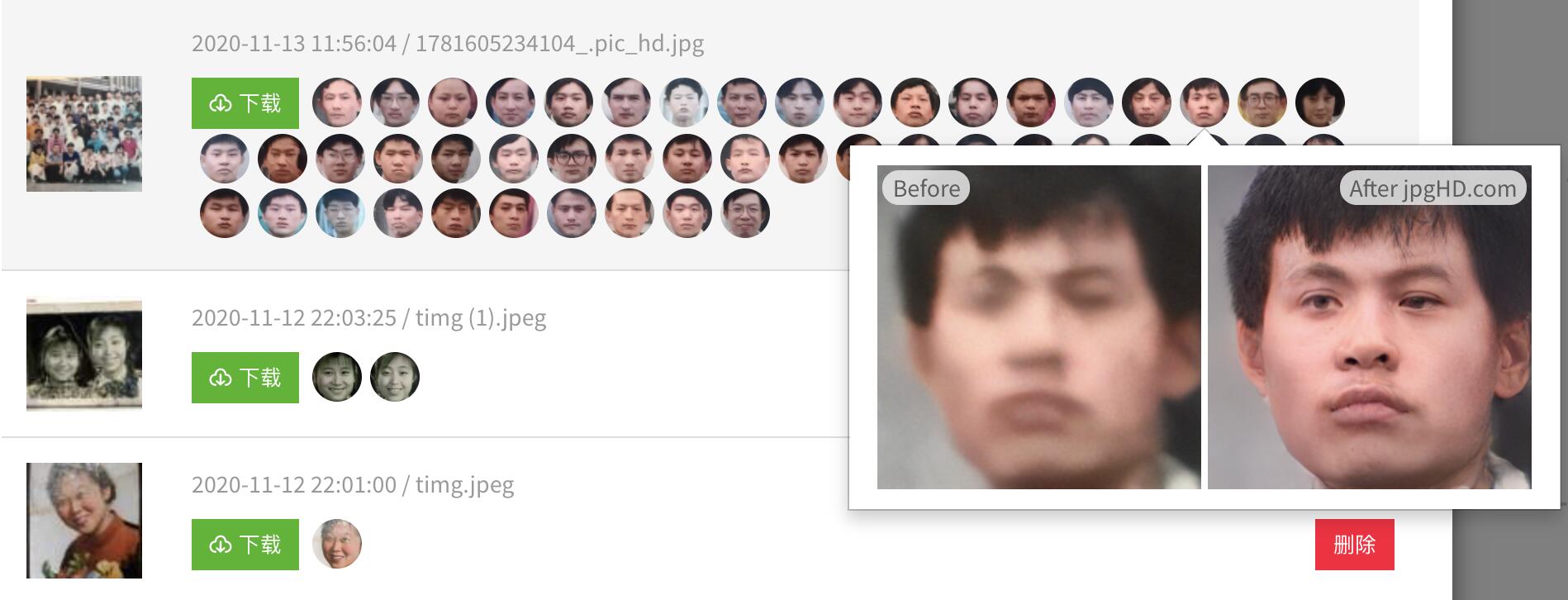 - jpgHD.com 使用了2020年最先进人工智能 AI 超分模型和深度学习技术来将低清破损有噪点图片处理成高画质高分辨率图片同时支持破损老照片修复