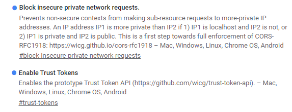 启用原型信任令牌API(GitHub - WICG/trust-token-api: Trust Token API). –Mac、Windows、Linux、Chrome操作系统、Android