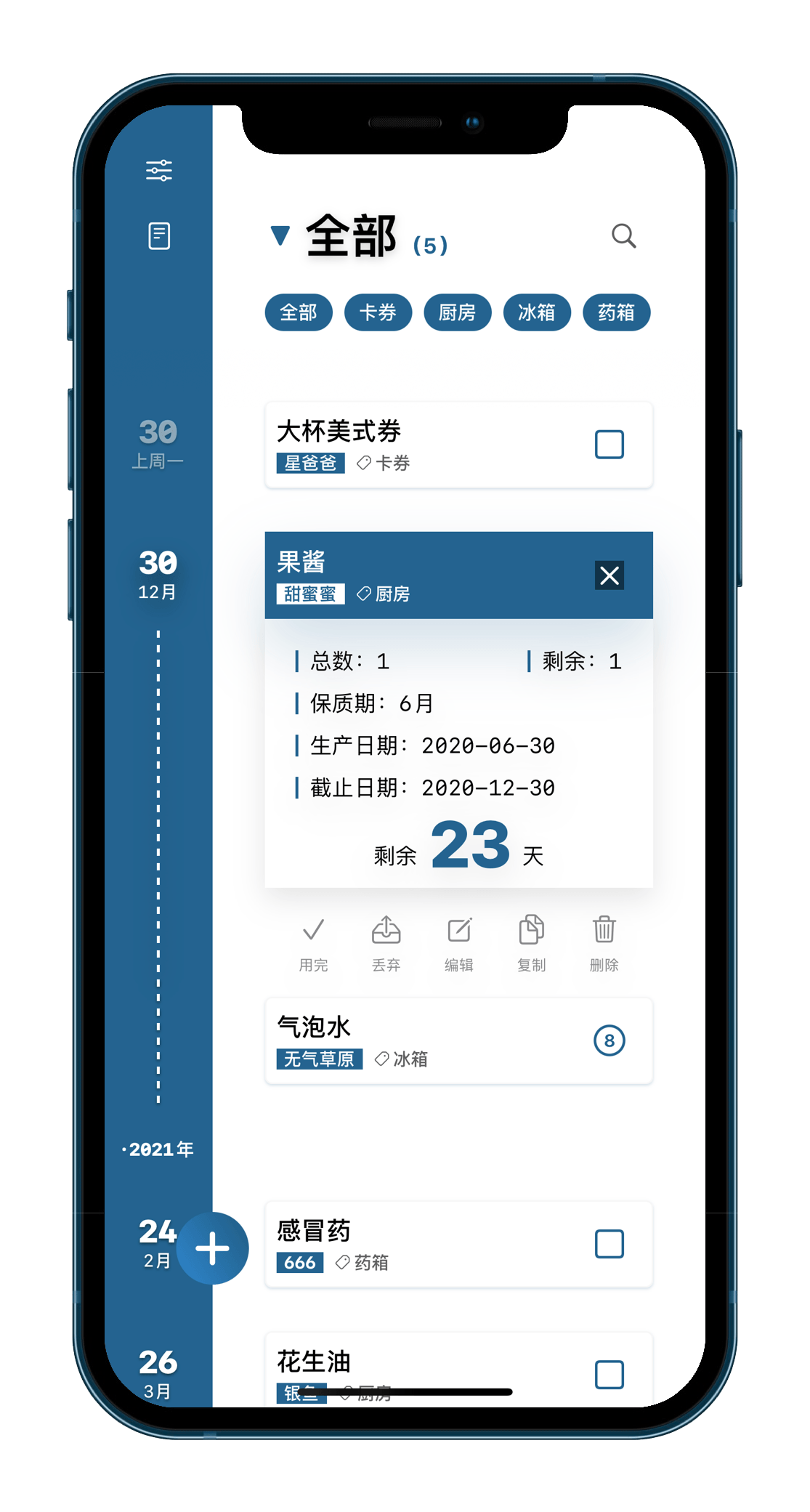 这是一个专门用于记录容易被忘记的事/物的生活工具类APP,食物、生活用品、药物、化妆品、卡券…所有有截止时间的都适合使用