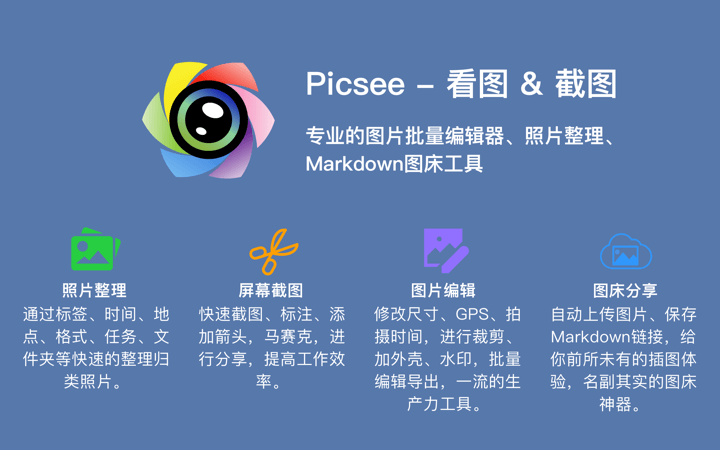 素材照片整理、收集、查找、截图、看图、图片批量编辑、Markdown图床工具。