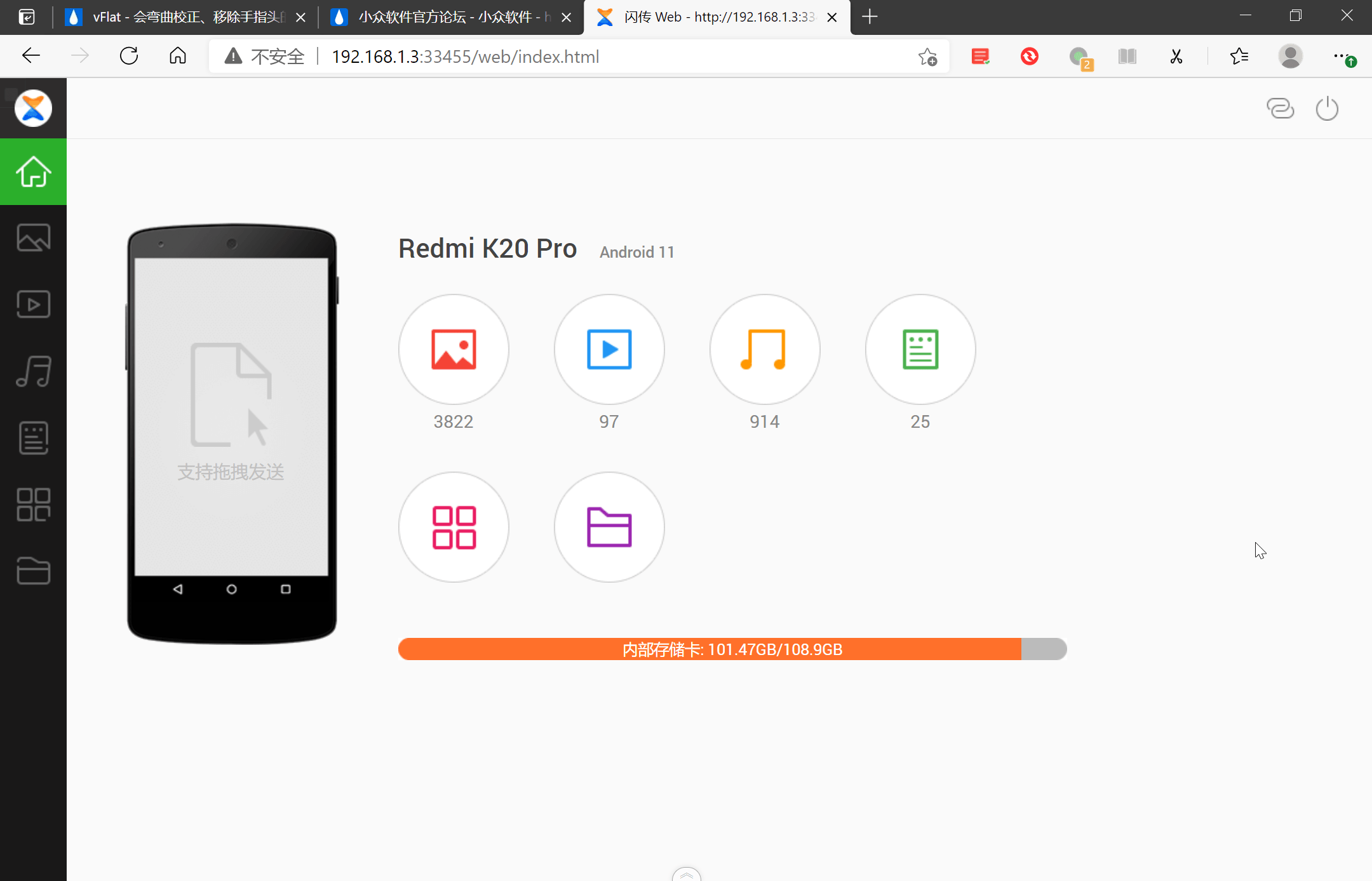 目前我找到了 Xender 这个比较满意的 App,它主要是做手机文件分享的,类似于快牙的应用,不过它有个连接电脑的模式,启用后,电脑访问手机 ip 上指定的端口,就可以通过网页端管理手机。