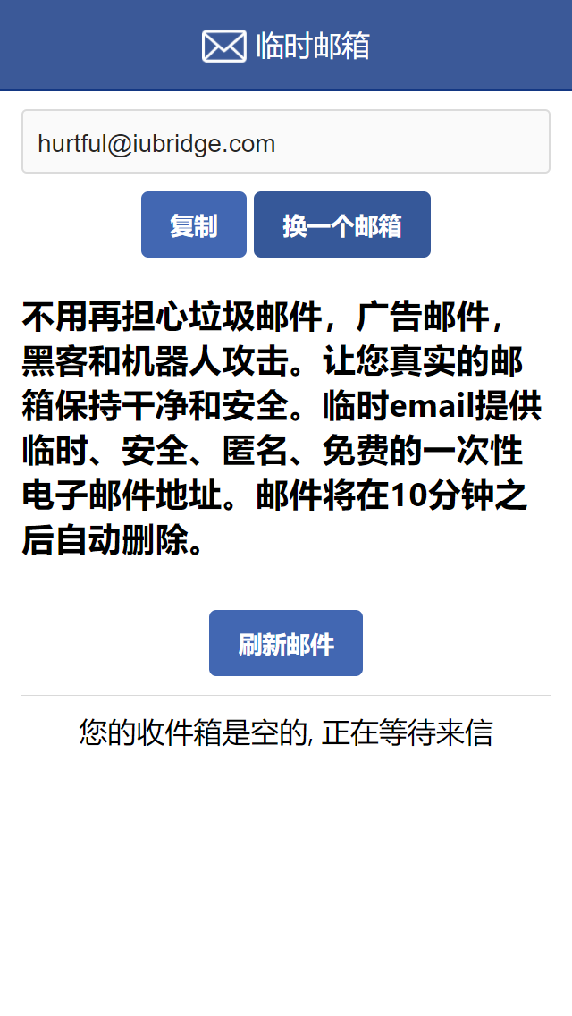 临时邮箱为您提供匿名的临时邮件地址,通过该临时邮箱接收邮件,用来保护隐私,防止信息泄露。