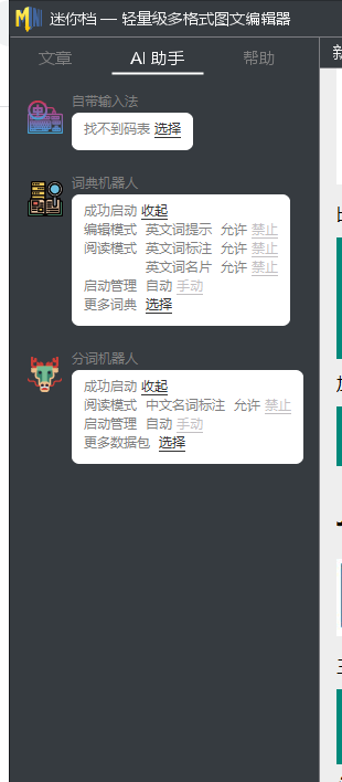 有个AI助手,里面可以设置软件使用软件自带的输入法。词典机器人在打字的时候会有提示。比如英文单词提示。