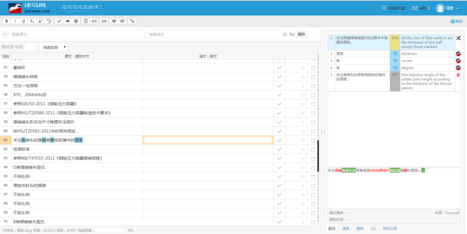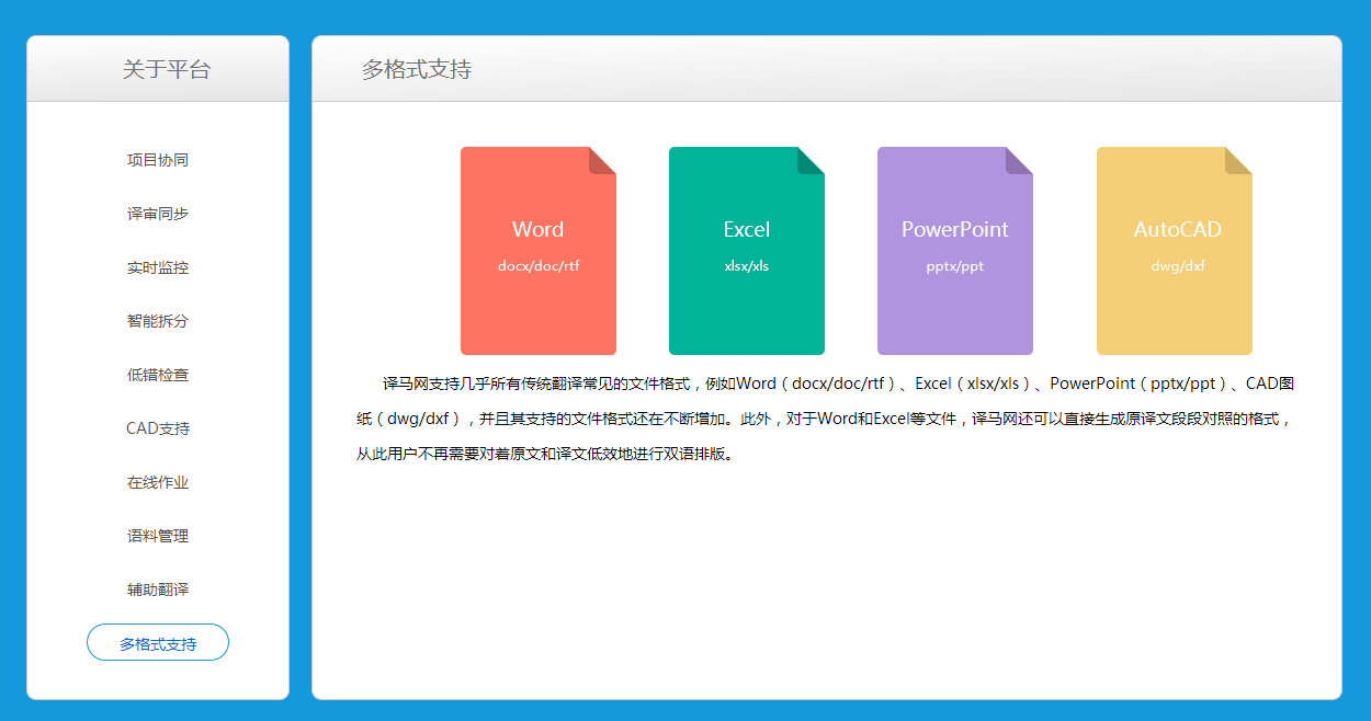 产品功能:项目协同、译审同步、实时监控、智能拆分、低错检查、CAD支持、在线作业、语料管理、辅助翻译