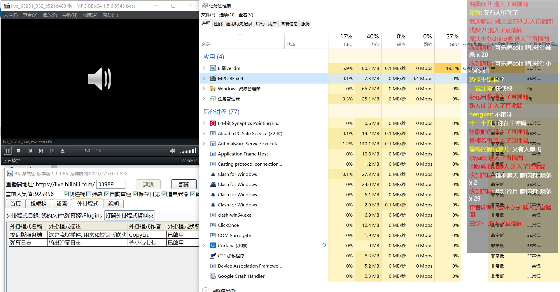 那么反过来讲,作为一个观众,在屏幕完全被占用做其他工作时还想看直播,该怎么办呢?能不能在后台播放时,仍然看到直播间其他观众的聊天——就像桌面歌词一样的悬浮弹幕呢?通过努力,我发现是有的。我找到一款这样的软件: GitHub - copyliu/bililive_dm: B站弹幕姬 - B站直播彈幕工具