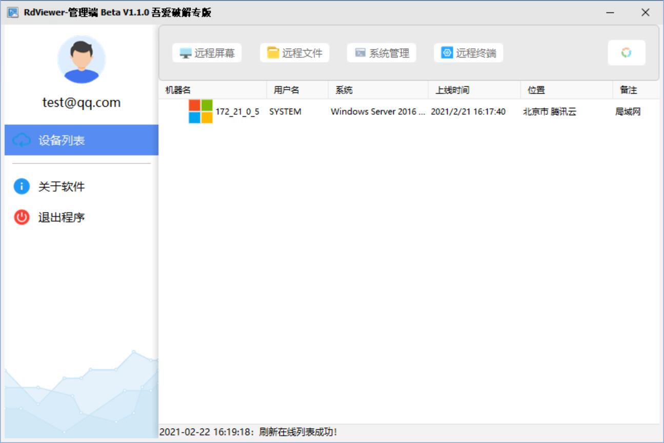 软件简介: RdViewer——使用P2P网络通讯,支持跨平台管理,端到端的压缩加密技术,在保证数据传输安全的同时,又很少占用带宽。功能包括:远程屏幕、远程文件、系统管理、远程终端、发送消息、重启关机等功能。