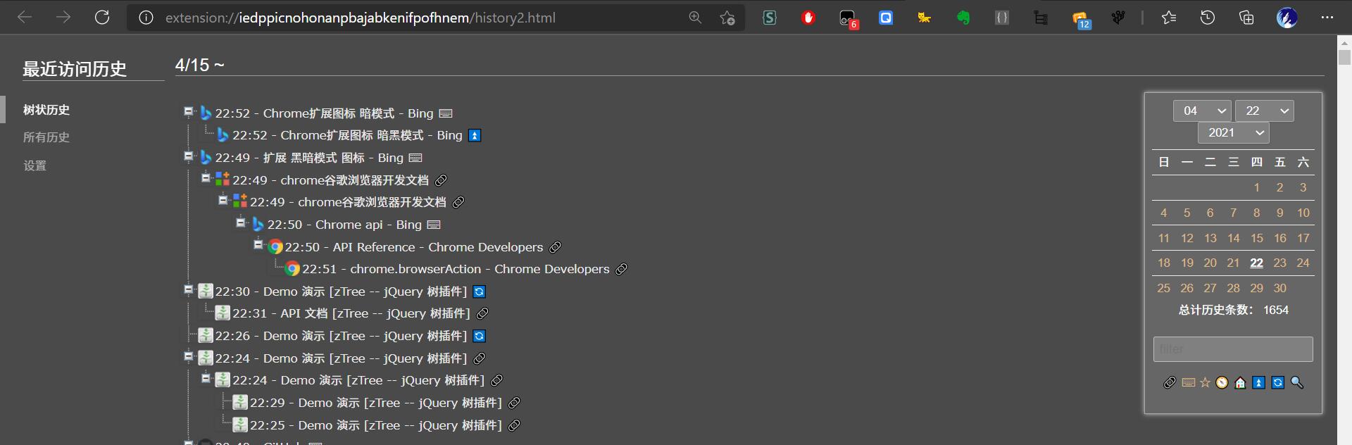 除此之外,为树状历史页增加访问类型筛选功能,历史数量较少时自动载入前日记录,调整默认的设置参数,增加了对网址标题特殊符号的处理