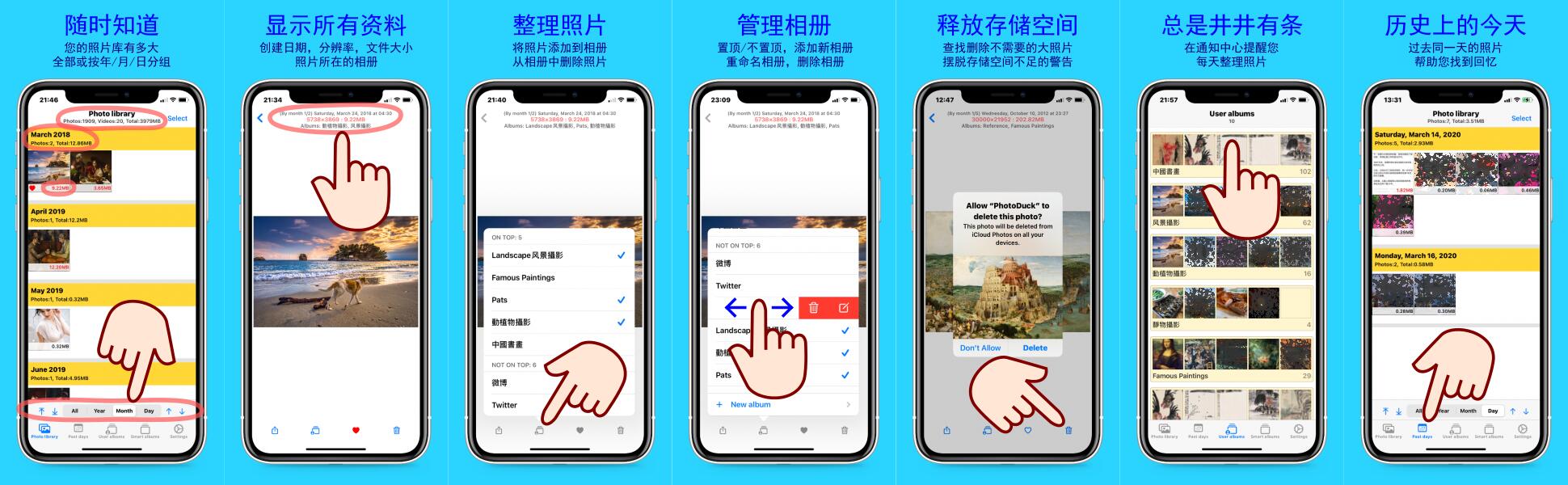 用相簿归类整理照片:“PhotoDuck”可以将一张照片同时移入/移出多个相簿,还能置顶常用相簿,非常方便。