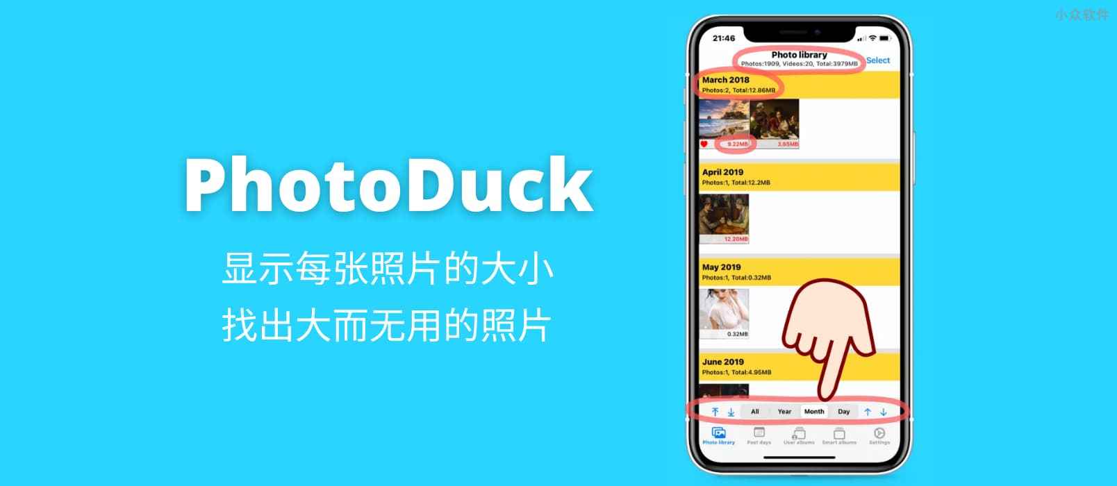 “PhotoDuck”解决了这个难题!这个app显示每张照片的大小(大文件红色显示)和整个照片库的占用空间,还实时显示按年/月/日分组占用空间。可以轻松找出那些大而无用的照片删除它们!