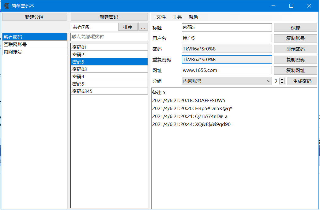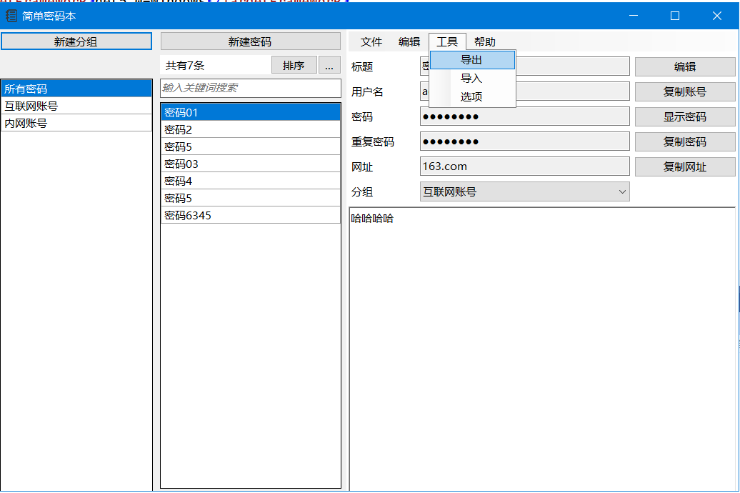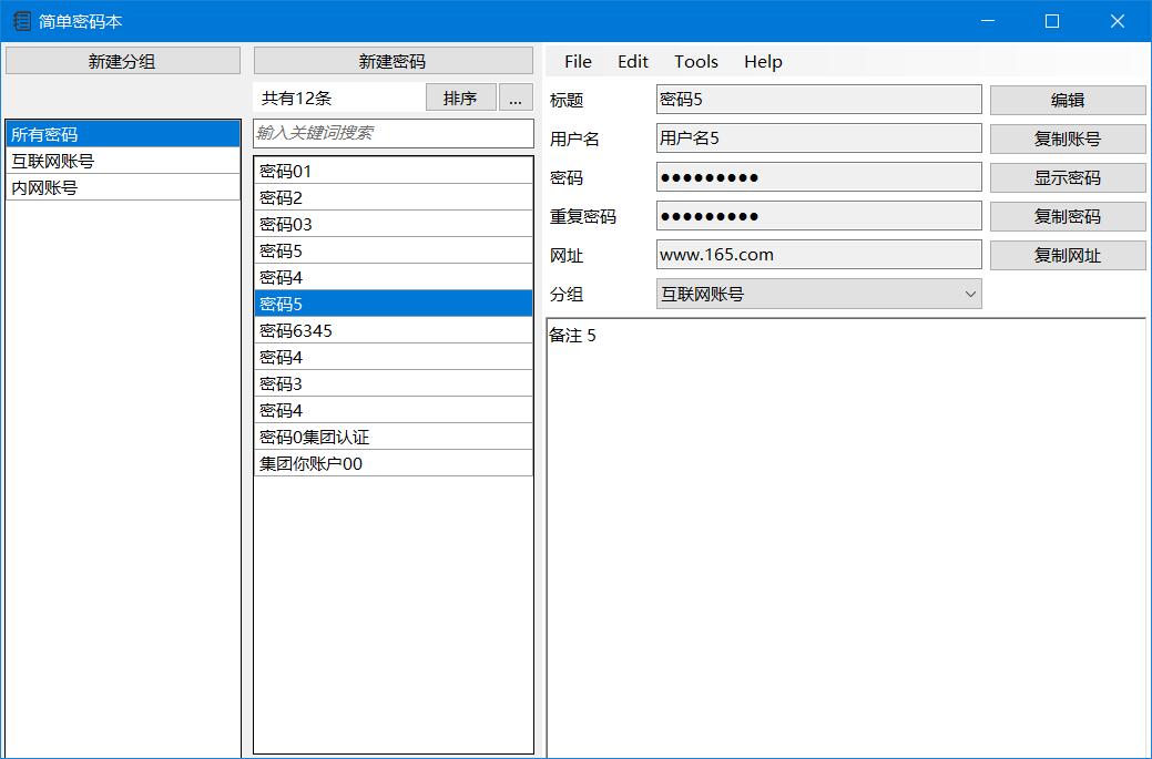 - 可创建分组,提供 复制密码, 复制账号 的按钮,一键将密码复制至剪贴板中。