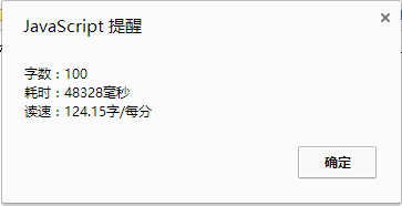 javascript:var i=i||0,t=t||{},d=new Date();t[i]=d.getTime();i>0?alert("字数:"+document.getElementsByTagName("pre")[0].innerHTML.length+"\n耗时:"+(t[i]-t[i-1])+"毫秒\n读速:"+(document.getElementsByTagName("pre")[0].innerHTML.length/((t[i]-t[i-1])/60000)).toFixed(2)+"字/每分"):i+=1;