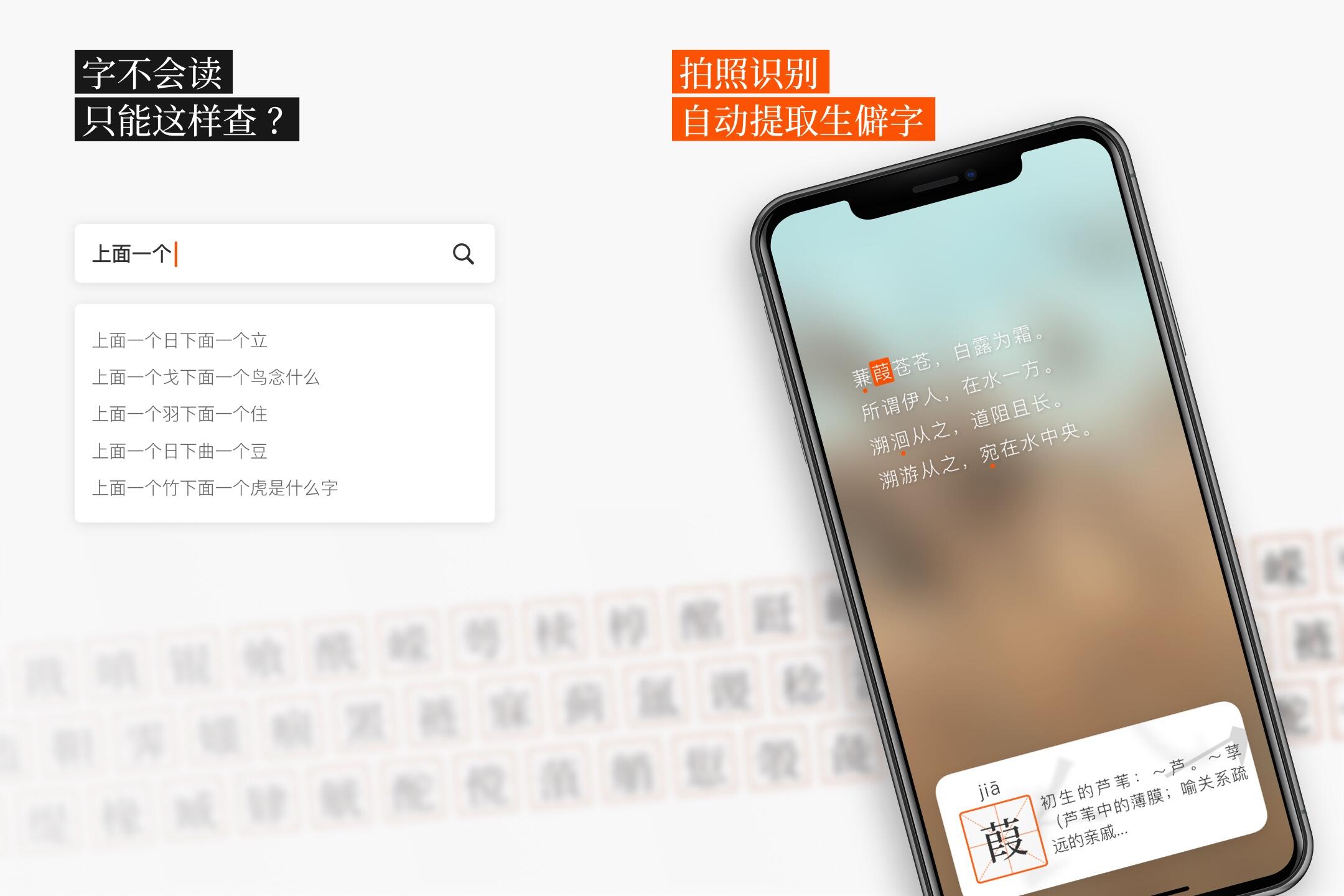 App 会基于 OCR 技术自动识别文字并拣选出其中的生僻字,大幅提升查字效率,也解决了生字用拼音打不出来的尴尬。