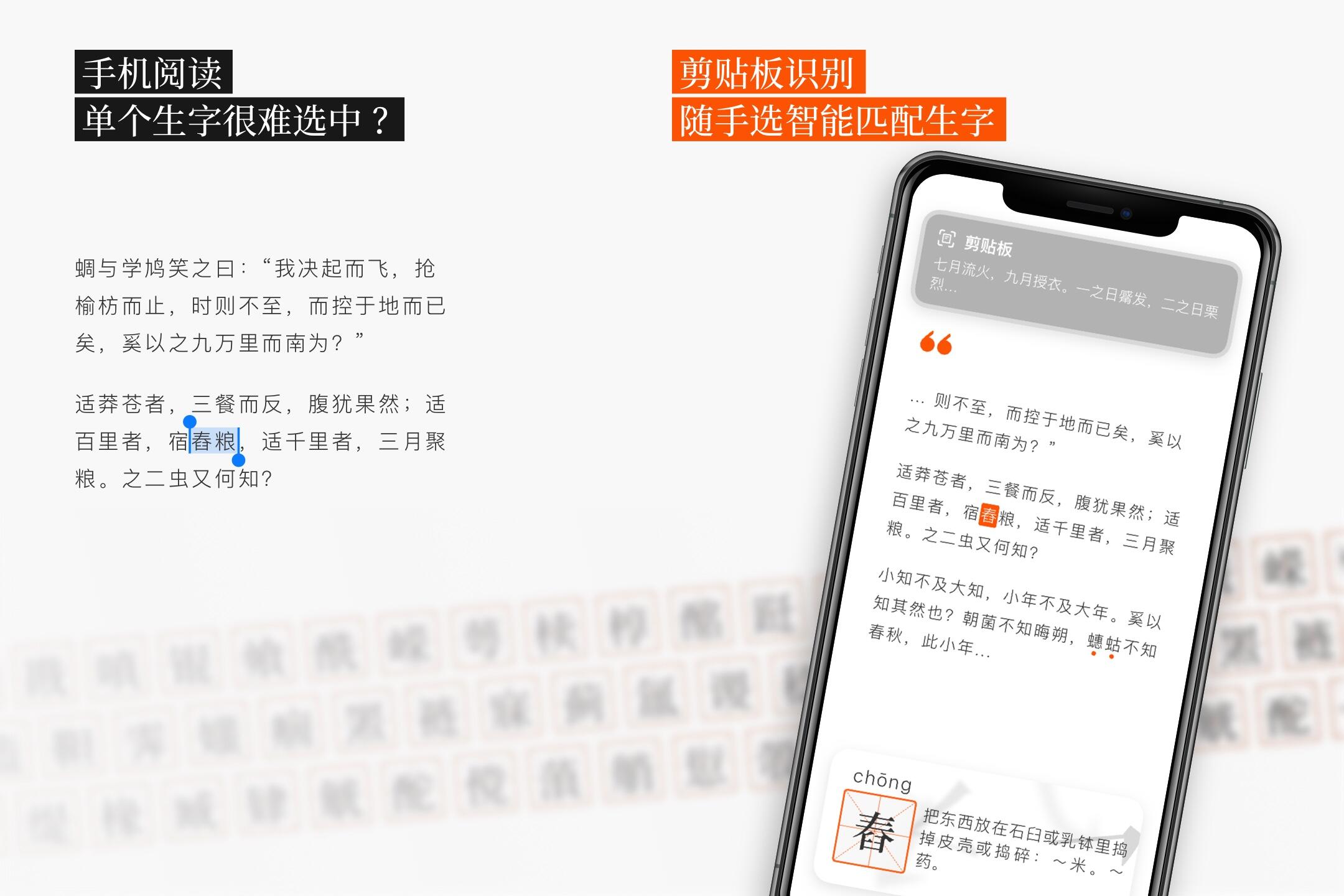 复制后打开解字,也无需再手动输入,App 会自动读取剪贴板并拣选生字查询。