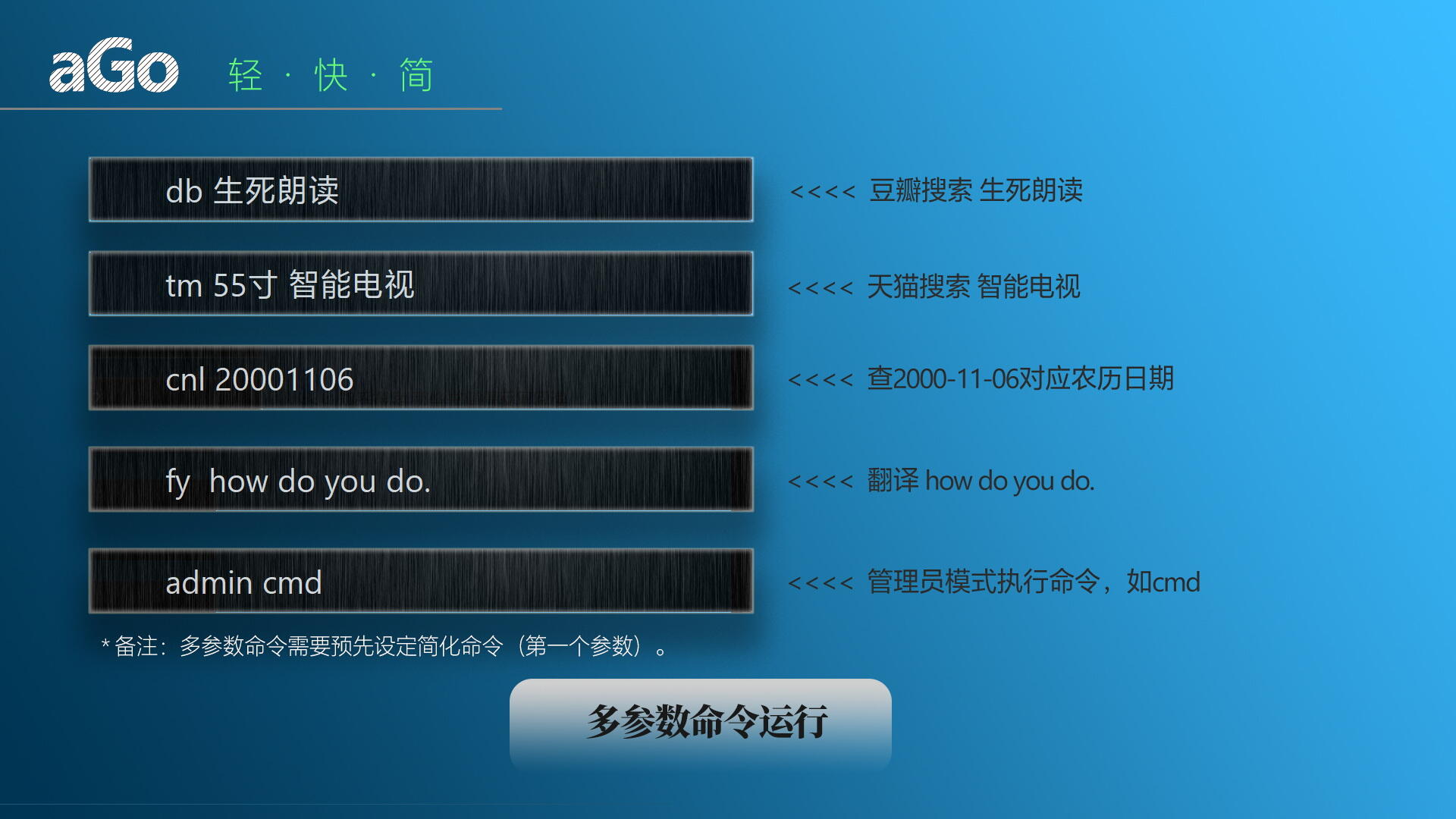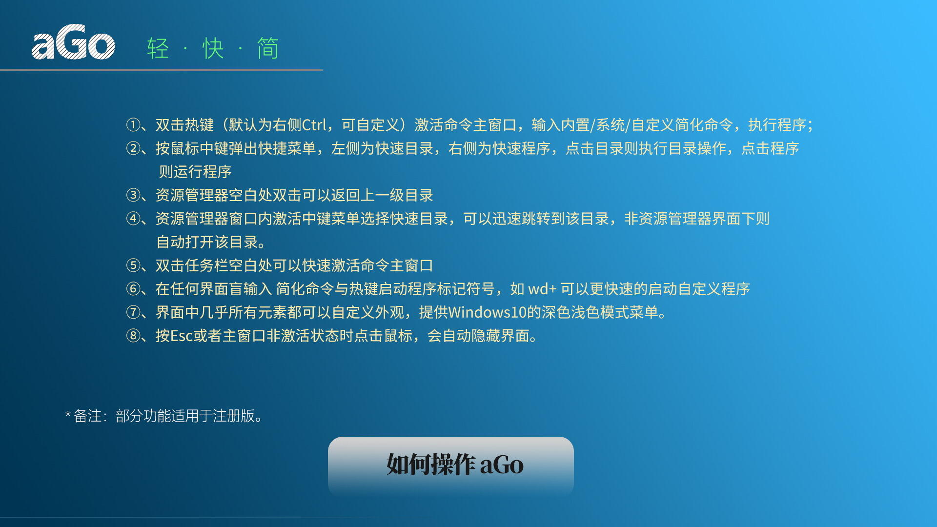 aGo 属于效率提升类软件,是综合键盘输入和鼠标操作菜单的软件,主要用于 快速启动程序和快速文件夹跳转,适用于Windows系统,aGo 占用内存小,在常驻后台占用一般在0.5~1.3M左右。