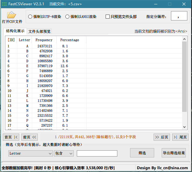 具备简单的统计功能,打开csv文件后,立即显示总行数以及字段数,可以帮助使用者快速掌握文件架构信息。