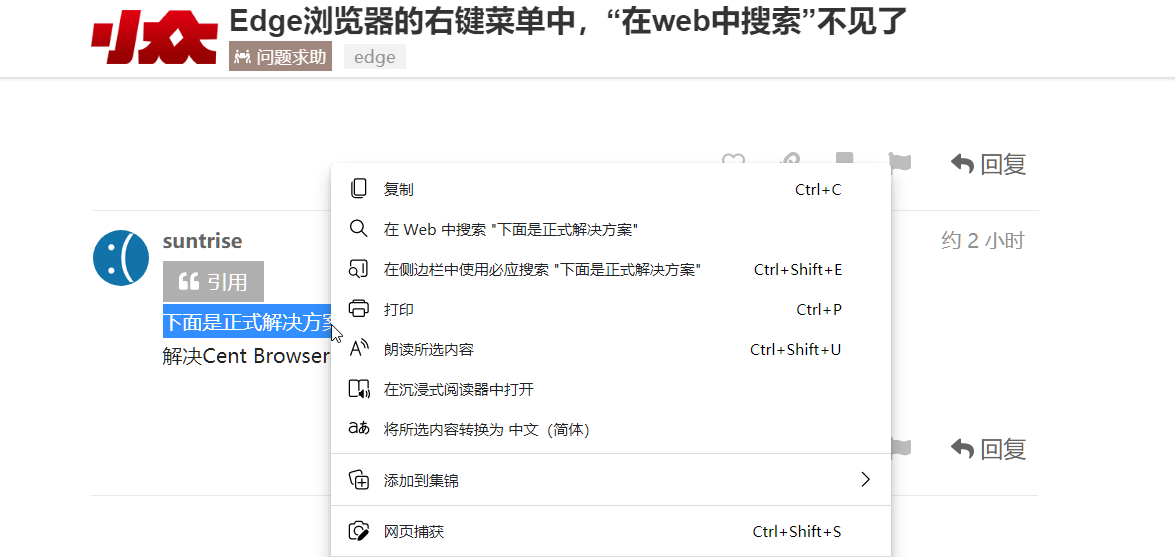 上网查了一下,不止我一个人遇到了这个问题,而且也就是最近这几天:求助,右键菜单中,在web中搜索不见了。【edge吧】
