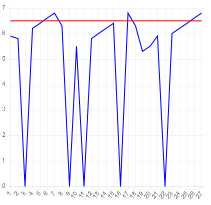 折线图中的红色标线为目标起床时间,蓝色线为当日起床时间,早起时蓝线在红色之下,晚起时蓝线在红线之上,蓝线底部的尖点表示当天没有记录时间