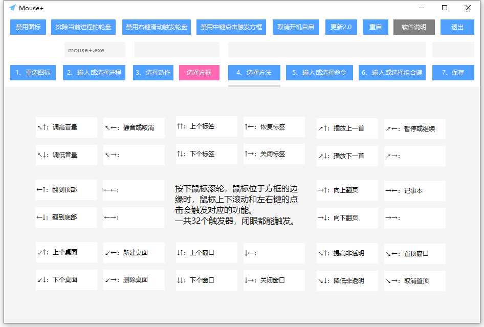 和鼠标手势不一样,不用画图形。是用鼠标碰方框来触发,方框每个边缘代表不同动作,然后加上鼠标滚轮和左右键点击来最终触发。