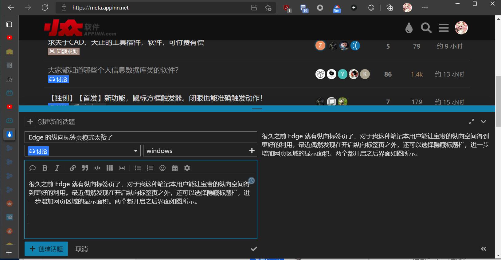 对于我而言, Edge 只是模仿出了形,体验还停留在又不是不能用的水平。Btw, 如果真的有垂直标签页的需求,Firefox 和 Vivaldi 是更好的选择。