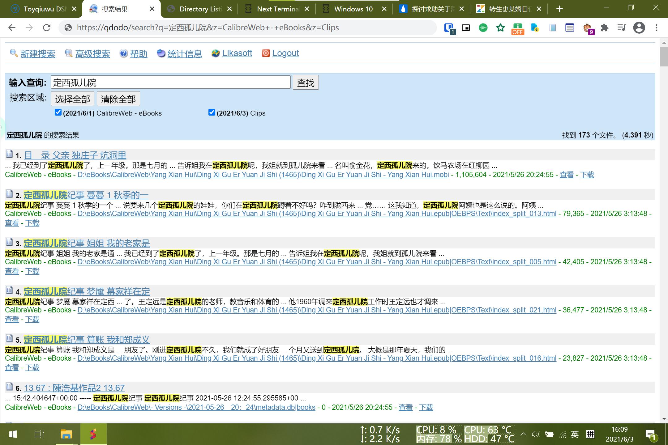 我清楚明白了这个软件很流弊,能全文搜索,支持epub mobi 。正巧,我软路由7x24跑着一台win10,但是它不支持web服务,没办法把索引指定路径下的html结果显示在web上。如果能web查询的话这样的话就能全平台随时随地查询了!