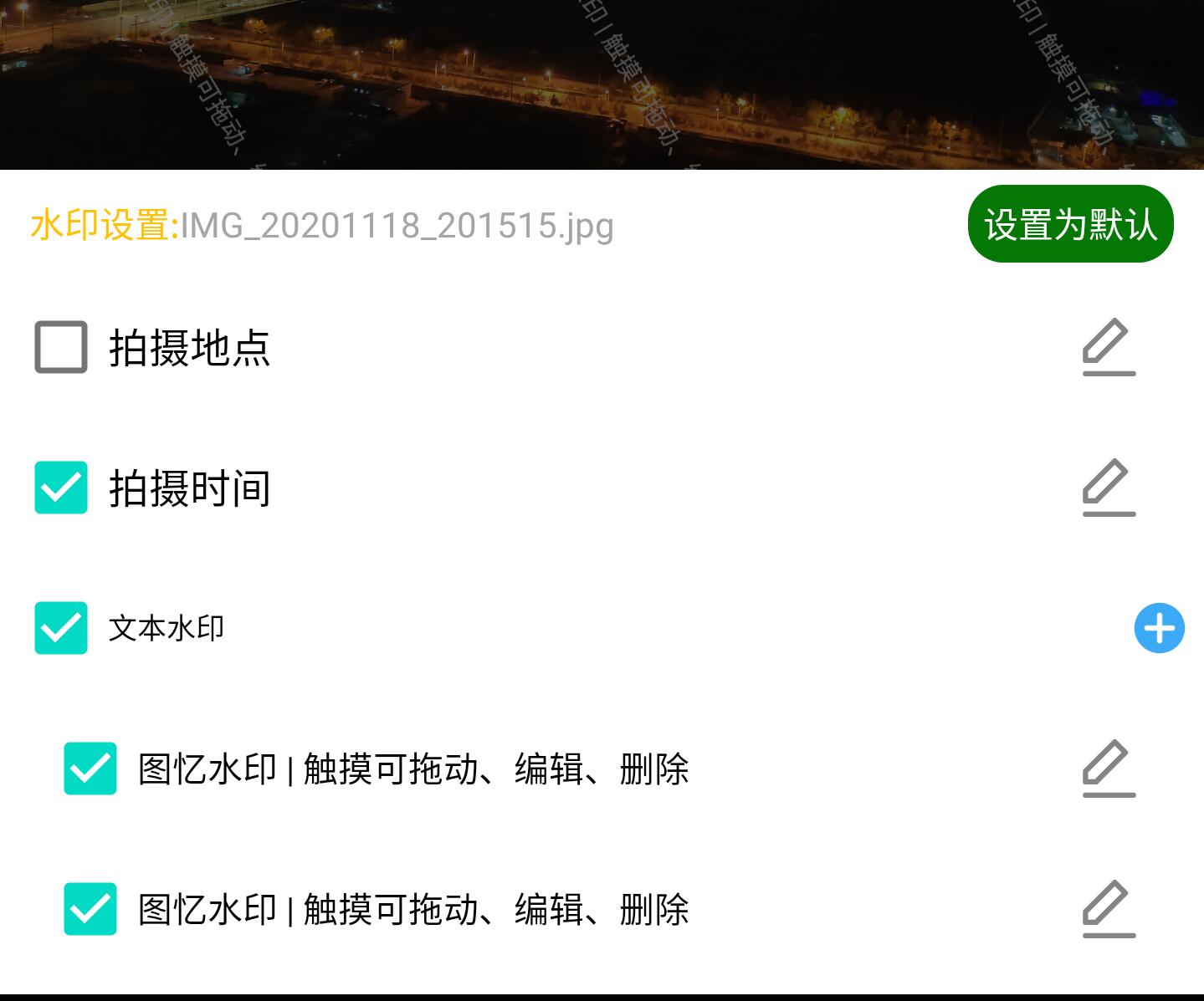 自定义图片默认加入的水印,可选加入或不加入默认文本水印,拍摄地址,拍摄时间;还可以对默认水印进行多方面设置。