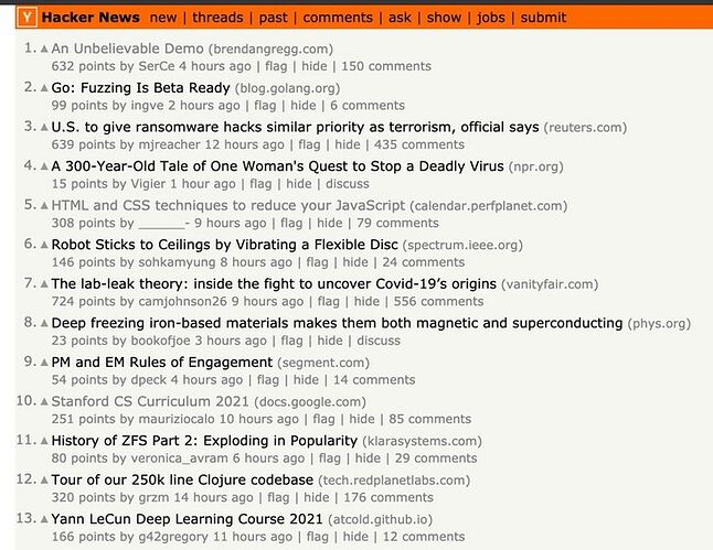 首页展示出了我最喜欢的三个模块:新闻(TOP)、黑客作品秀(SHOW HN)、黑客好问题(ASK HN)。