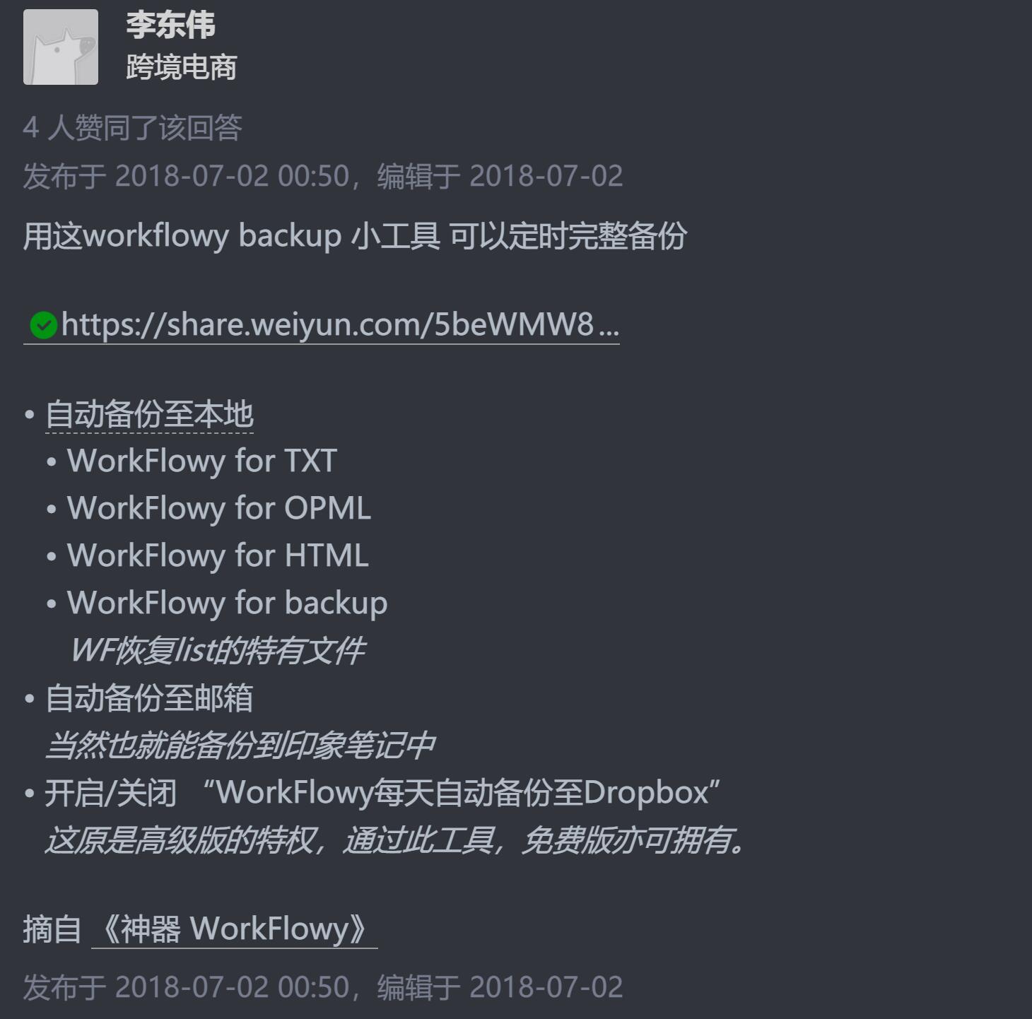 前几天在知乎的这篇贴子里看到workflowy备份工具,文中的微云链接已经失效,联系答主也联系不上了。