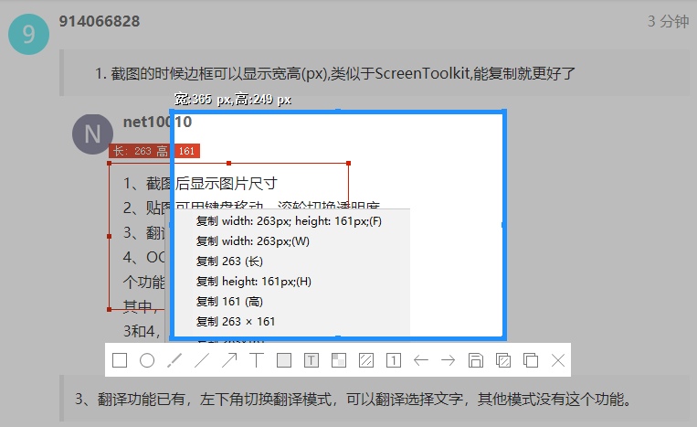 - 截图的时候边框可以显示宽高(px),类似于ScreenToolkit,能复制就更好了
