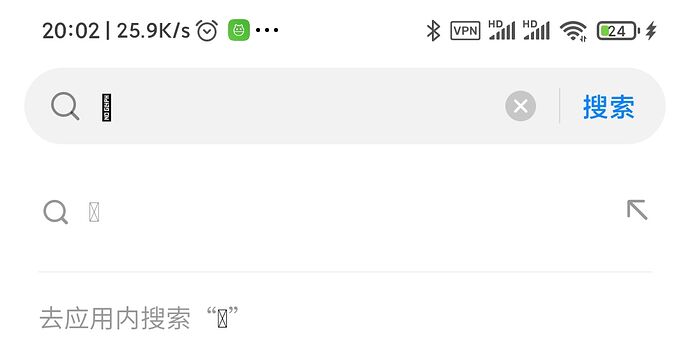 在不同软件、不同位置,对字体的支持也不尽相同。截图中的搜索框内显示无字体支持的汉字为黑色方块,搜索历史中展示为白色方块。