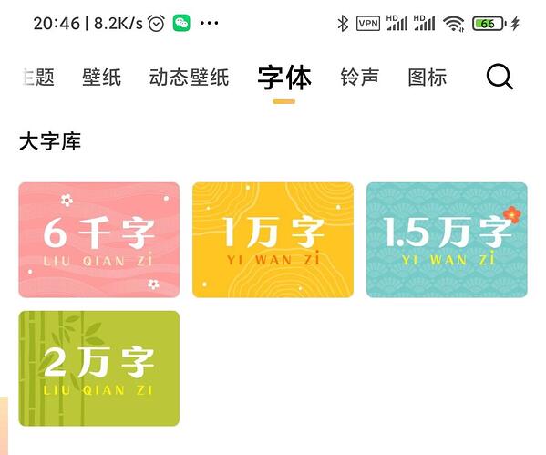 但是这仍然不是全部汉字。在Unicode标准中,汉字数量已经高达92844,目前仍然在修订增加中。为数量这么庞大的汉字做字体,工作量是巨大的,也是不现实的。下图是MIUI的字体分类,按照文字数量统计,所谓大字库也只是覆盖1-2万文字。事实上,大量个性化字体连GB2312的六千汉字都不能完全覆盖。