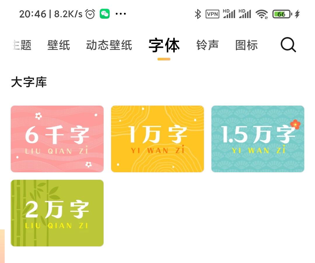 但是这仍然不是全部汉字。在Unicode标准中,汉字数量已经高达92844,目前仍然在修订增加中。为数量这么庞大的汉字做字体,工作量是巨大的,也是不现实的。下图是MIUI的字体分类,按照文字数量统计,所谓大字库也只是覆盖1-2万文字。事实上,大量个性化字体连GB2312的六千汉字都不能完全覆盖。