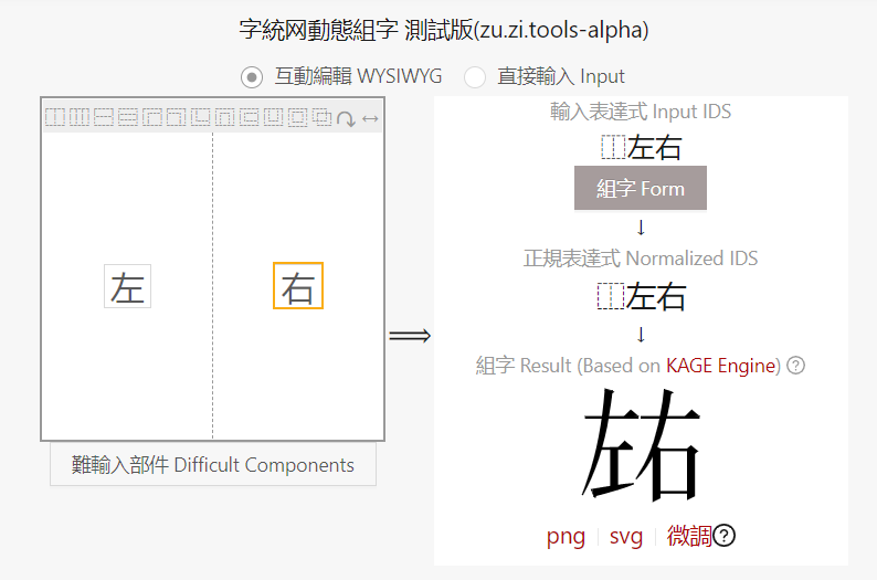 注意在页面右侧,有一个单词 IDS。IDS是Ideographic Description Sequences的缩写,通俗的讲就是通过表达式来描述一个字是怎么组成的,有点意思。