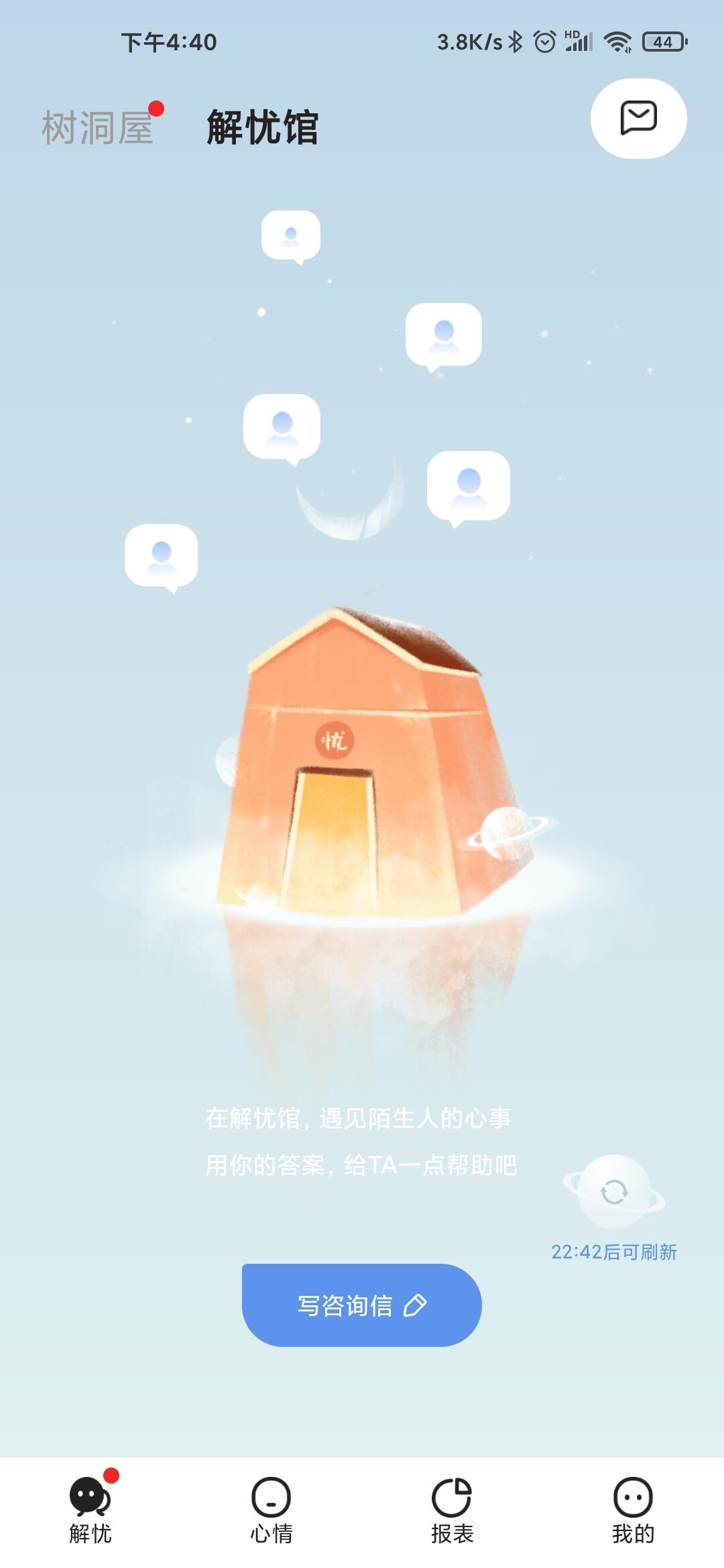 2、 在解忧馆,点击刷新后,会从解忧馆中释放用户的咨询信(动态小气泡会升起来)点击跳动的小气泡即可查看陌生人的咨询信,并给陌生人鼓励或回复。