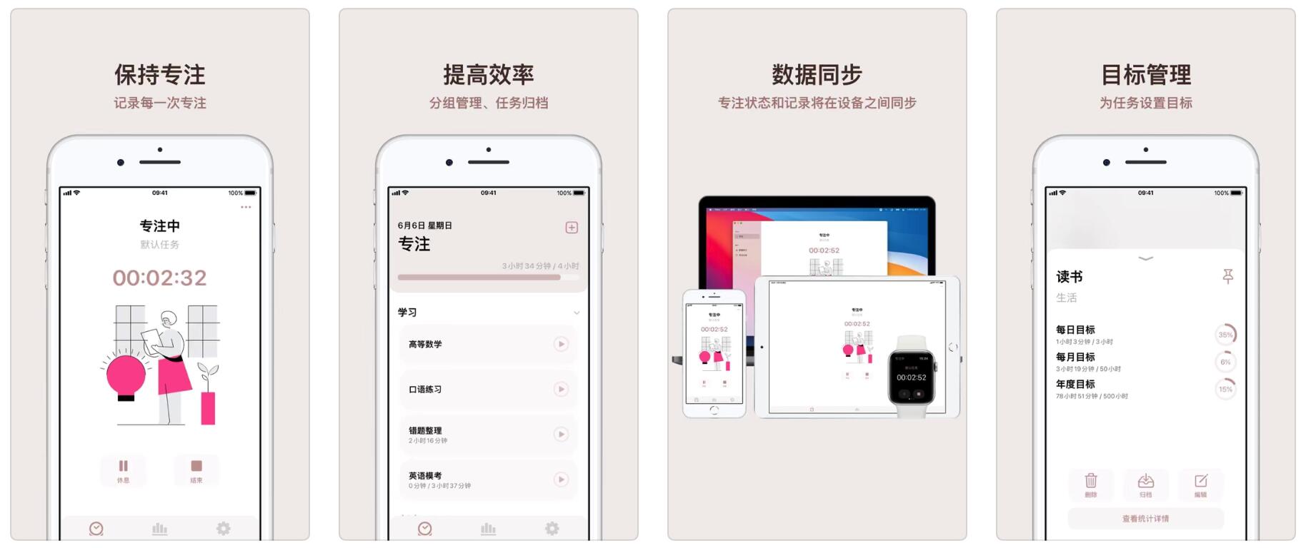 - 专注状态实时同步,只需在一处开始专注,在其他设备上都能看到当前专注时长