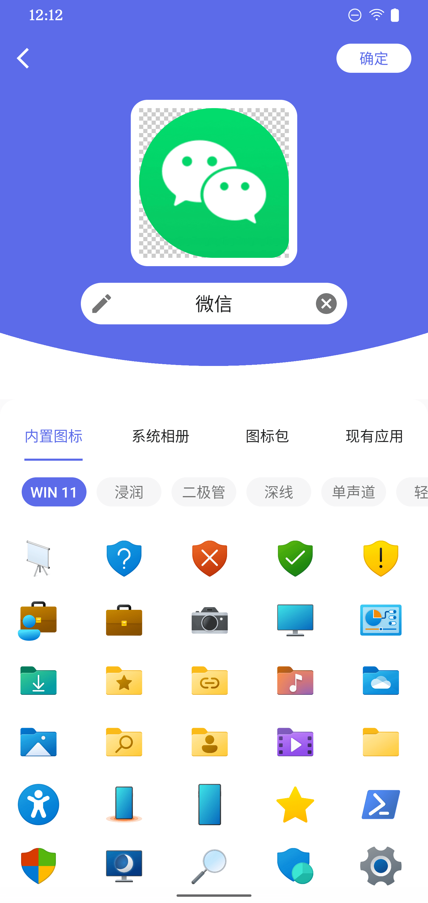 目前可以从 4 个来源选择定制图标。快捷图标内置了若干套图标可以使用(内置图标),它还可以浏览本机上已经安装的第三方图标包(图标包),或者移花接木,直接选择使用已经安装的另一个 app 的图标(现有应用)也可以。