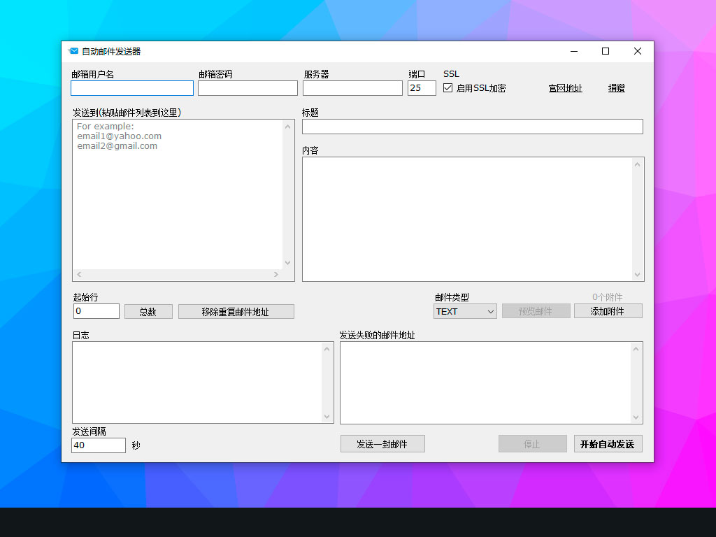 程序的主窗口非常简单,所有功能和设置都可以直观的看到和操作。你可以先输入自己的电子邮件地址、密码、电子邮件服务器地址和端口,然后输入目标电子邮件收件人列表。你可以在“发送到”列表中一一输入,也可以直接复制粘贴联系人列表进去。