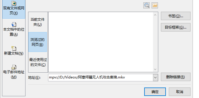 - 现在就不知道怎么把这个命令弄到word超链接上,点击超链接,就能定位到视频的指定时间里.我尝试在地址栏写上:mpv://*.mpv 好像也不行.