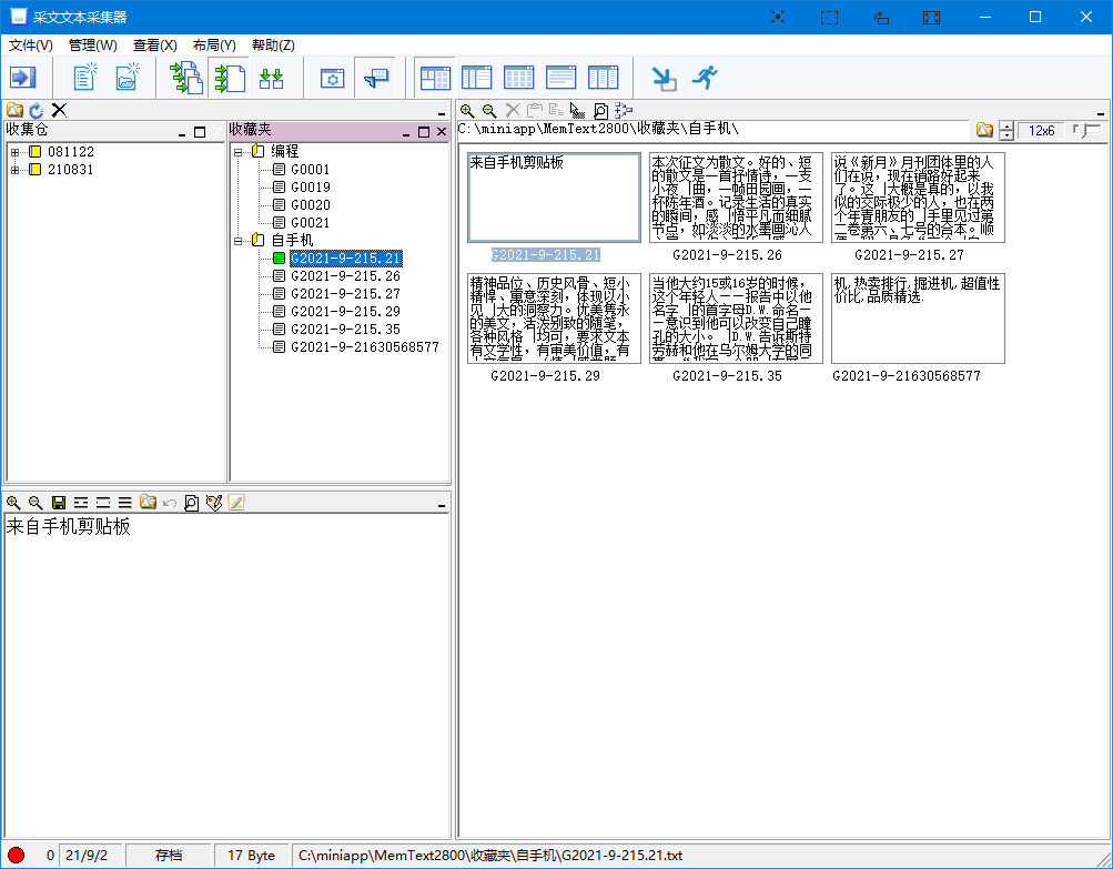 实现原理:监听储存所收藏文本的文件夹,当有新增文件(即新收集的文本时),自动将文本从unicode转码为ANSI,保持ahk文件运行状态,就可以无忧使用采文了。