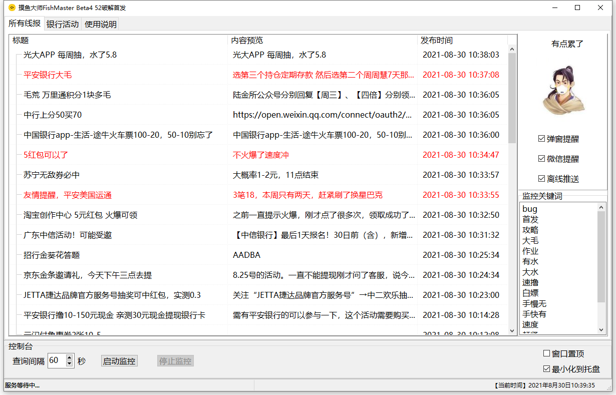 众所周知现在各种优惠活动层出不穷,为了不错过任何一个活动线索,于是我开发了一款能够监控新文章并根据关键词进行推送的工具~
