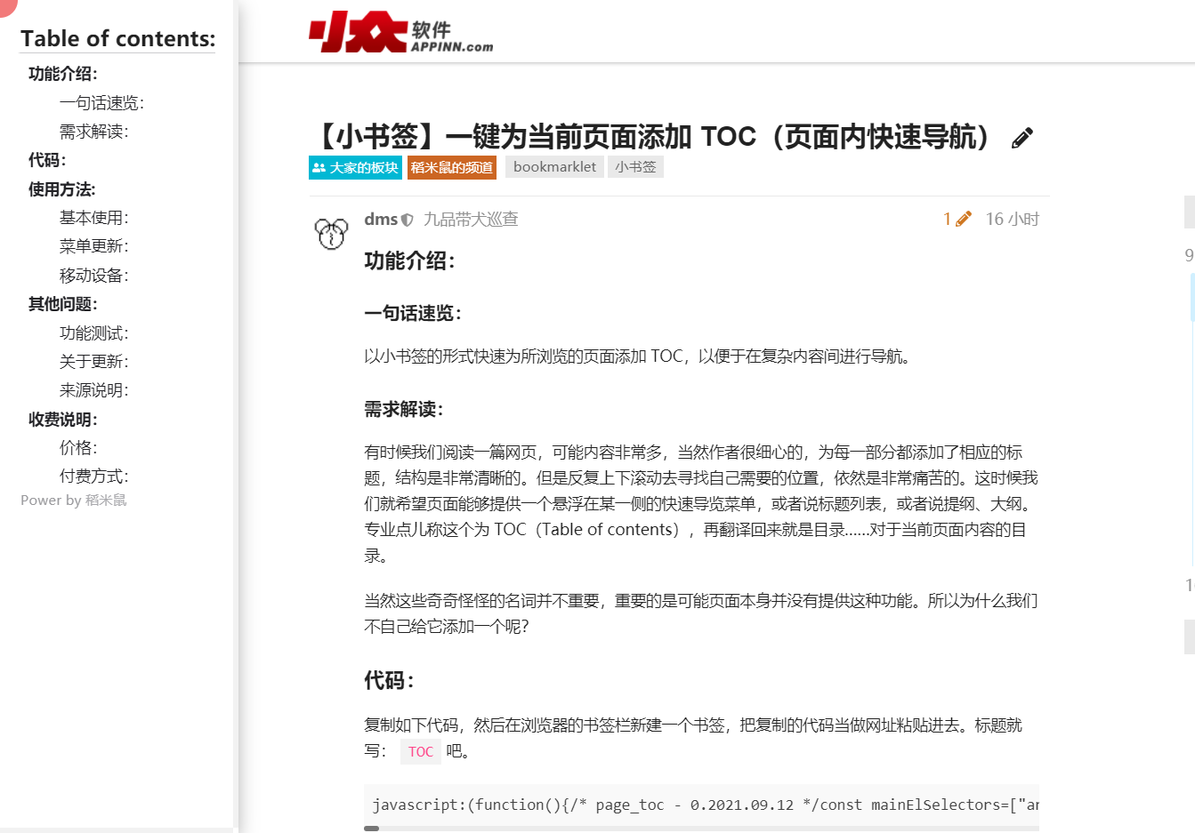 在页面加载完成后,点击这个小书签,就会在页面左侧添加 TOC 菜单。点击其中的项目,可以在页面中快速导览。点击左上角的红色按钮,可以切换菜单的显示和隐藏。