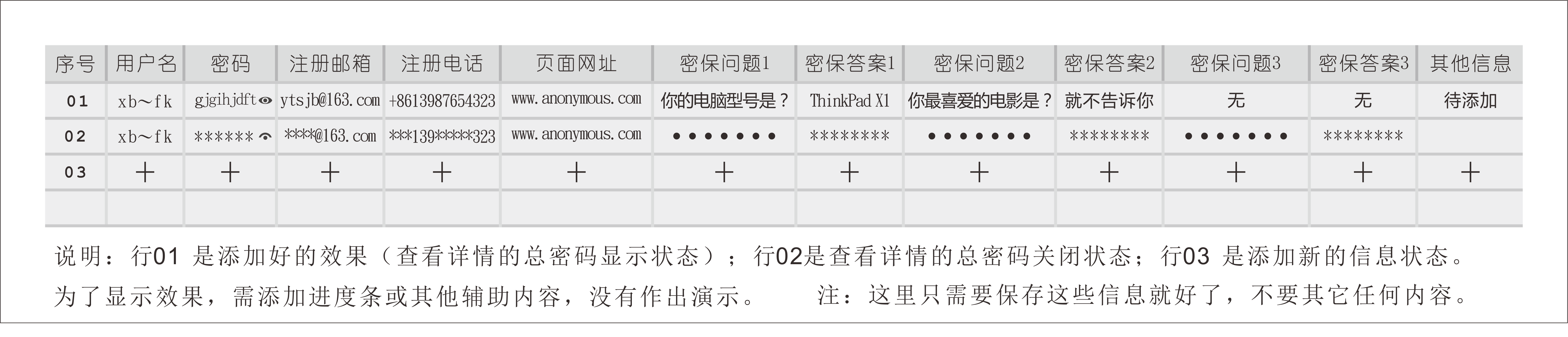 想开发一个密码管理软件,先弄Windows版本的,需要的是如下的样子,目前的密码管理软件对于密保等信息都没有专门的隐藏,甚至都没有专门的页面来显示,我认为 密保 的等级其实要比 密码更重要,很多时候 有了密保可以直接重置密码的,而且某些情况下我们还需要记录之前的密码,以备不时之需。