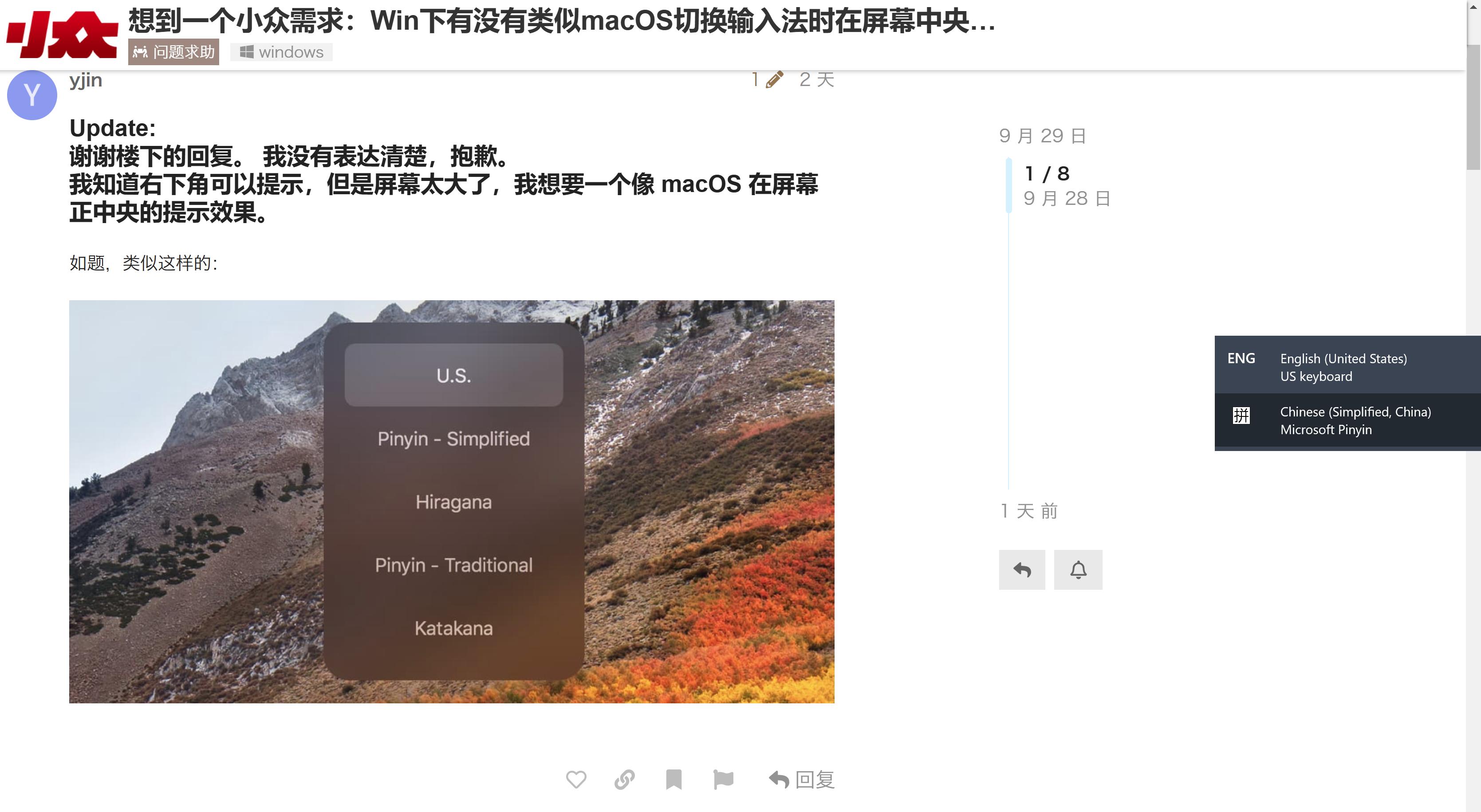 任务栏托盘显示不香吗? 像我这种频繁切换输入法的人, 如果屏幕中央这样显示, 反而会觉得是困扰.