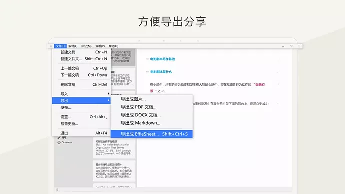 在支持导出为 PDF、DOCX、Markdown 等通用格式基础上,我们新增了便于共享的 Effie 专有格式 EffieSheet,同时优化了备受好评的图片导出功能。