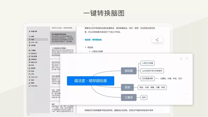 Effie 支持在文稿中创建大纲列表与思维导图,让你免于多软件切换之苦。