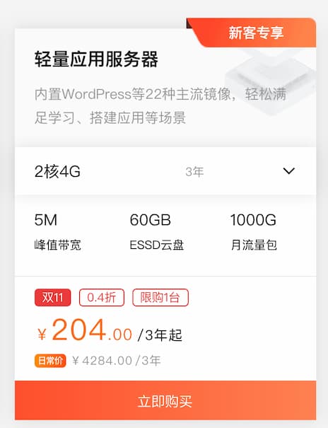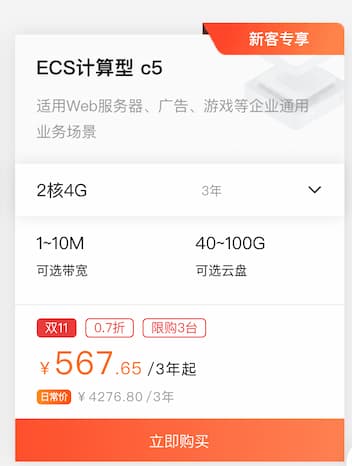 用这个邀请链接(有返利): https://www.aliyun.com/minisite/goods?taskPkg=1111ydsrwb&pkgSid=75639&recordId=1514635&userCode=zpda9d2e