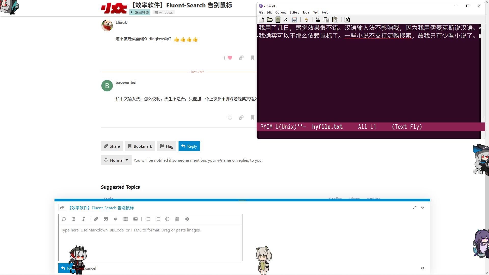 我用了几日,感觉效果很不错。汉语输入法不影响我,因为我用伊麦克斯说汉语。我确实可以不那么依赖鼠标了。一些小说不支持流畅搜索,故我只有少看小说了。