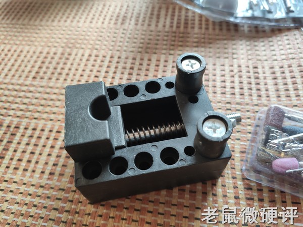 夹头部分的特写,中间的圆柱可以更换来适应不同粗细的金属柄。因为各种工具的金属柄粗细不一致,所以更换磨头的同时,很可能就需要更换对应的夹具,挺麻烦的说。当然也可以自己更换能够适配不同粗细的夹头。但那就要自己掏腰包了。而且不同夹头也算是各有利弊。反正我就先这么将就用着吧。